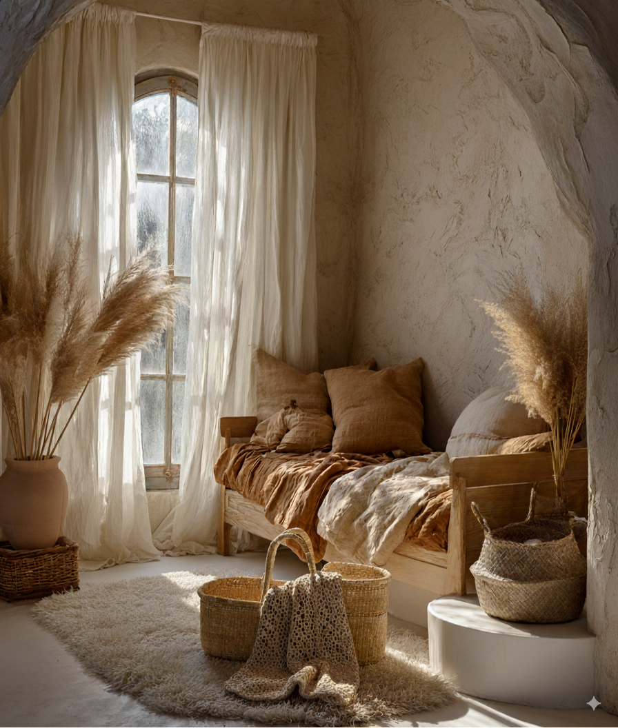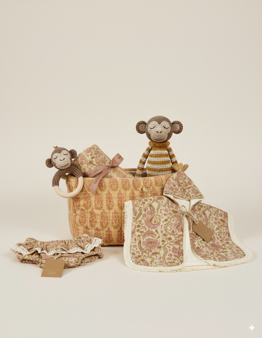 Un universo delicado donde los primeros años se llenan de objetos con alma: tejidos suaves, capazos artesanales, juguetes de cuento y tesoros que acompañan el comienzo de una gran historia.
