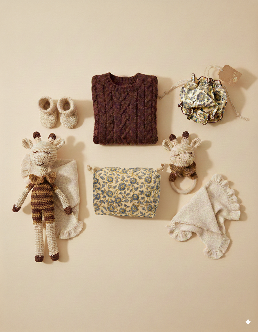 Seleccionamos con amor piezas hechas a mano por pequeñas marcas de India, África y Europa, pensadas para durar, emocionar y formar parte de vuestra memoria familiar.